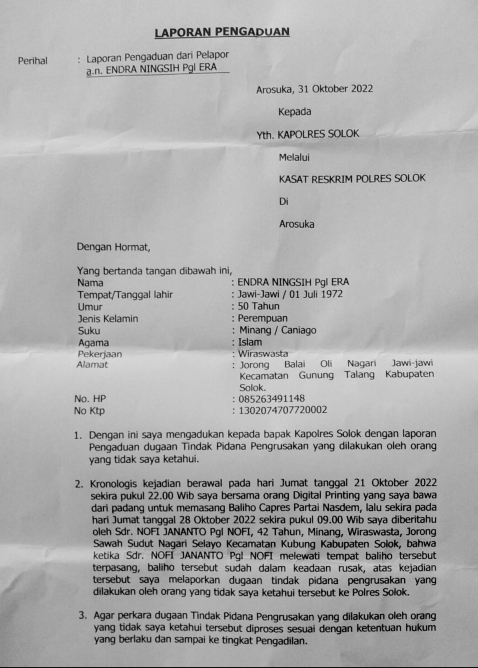KABUPATEN SOLOK, AmanMakmur.com —Dewan Pengurus Daerah (DPD) Partai Nasdem Kabupaten Solok melalui Kepala Sekretariat Endra Ningsih melaporkan dugaan tindak pidana pengrusakan ke Polres Arosuka sehubungan dengan hilangnya baliho bergambar capres Anies Baswedan dengan pengurus DPP Nasdem Willy Aditya, Senin (31/10/2022).