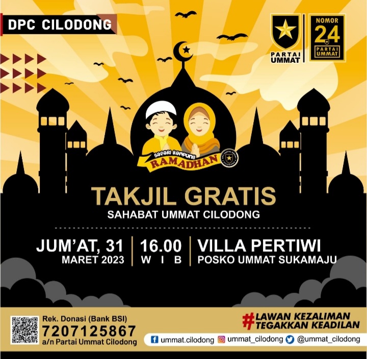 “Alhamdulillah hari ini atas izin Allah Swt, kegiatan berbagi takjil berbuka puasa dari DPC Partai Ummat Cilodong berjalan dengan baik,” ujar Kukuh Tri Prasetyo, Ketua DPC Partai Ummat Cilodong, yang didampingi Wakil Ketua Pembinaan Organisasi dan Kaderisasi, Irdam Imran.