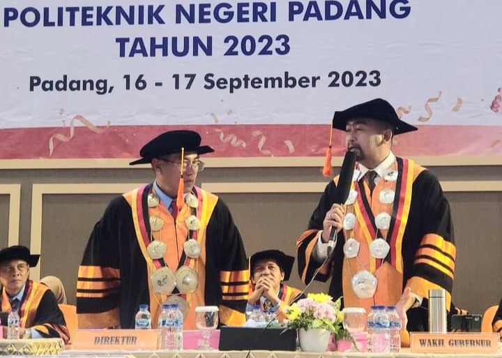“Dengan gelarnya yang panjang, menandakan Pak Wagub ini orangnya pembelajar, dan ini harus menjadi inspirasi bagi kita semua. Dan dengan ini, kita minta Pak Wagub untuk bisa menjadi staf pengajar di Politeknik Negeri Padang. Apalagi beliau ini memiliki sertifikasi enginer ASEAN,” ucap Surfa Yondri di hadapan ratusan wisudawan dan ribuan para orangtua dan keluarga wisudawan yang hadir di Gedung Pusat Kegiatan Mahasiswa (PKM) Kampus PNP Limau Manis Padang.