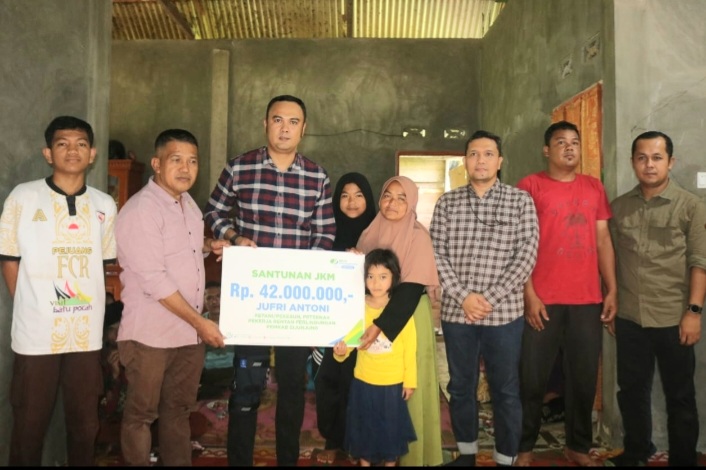 SIJUNJUNG, AmanMakmur—Bupati Sijunjung Benny Dwifa Yuswir menyerahkan santunan Jaminan Kematian (JKM) sebesar Rp42 juta kepada tiga ahli waris masyarakat di Kecamatan Sumpur Kudus, Sabtu (23/9/2023).