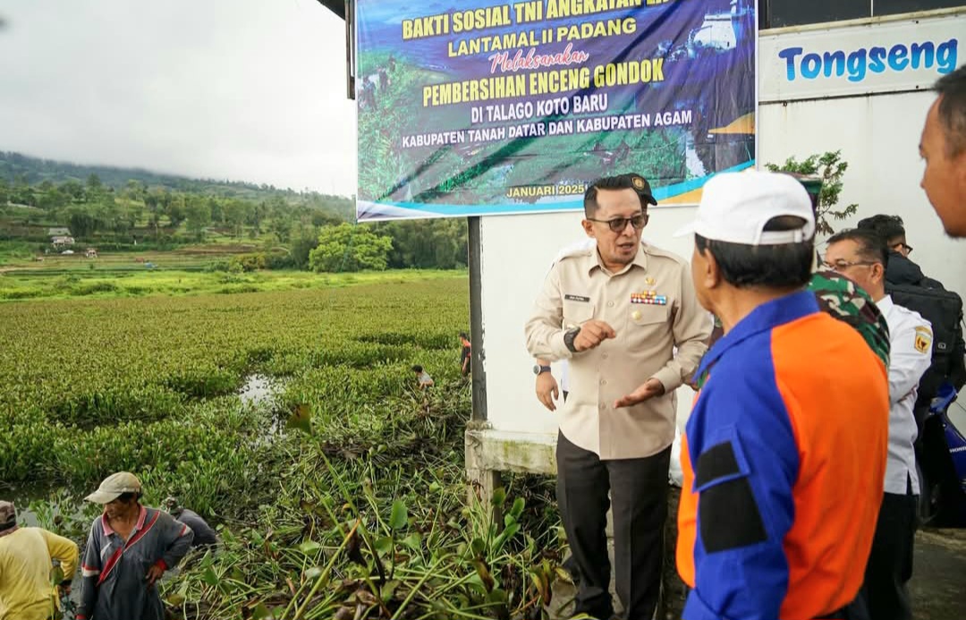 TANAH DATAR, AmanMakmur — Bupati Tanah Datar Eka Putra menyerahkan bantuan logistik dan armada secara simbolis kepada Lantamal II Padang yang melaksanakan pembersihan enceng gondok di Talago Koto Baru Kecamatan X Koto, Rabu (22/1/2025).