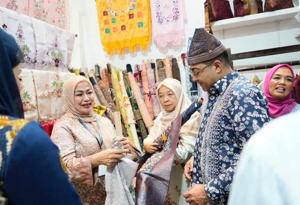 Menteri Ekraf Teuku Riefky bersama istri kagum melihat hasil karya UMKM Tanah Datar, salah satunya tenun yang motif dan kualitasnya sangat bagus dan menarik.