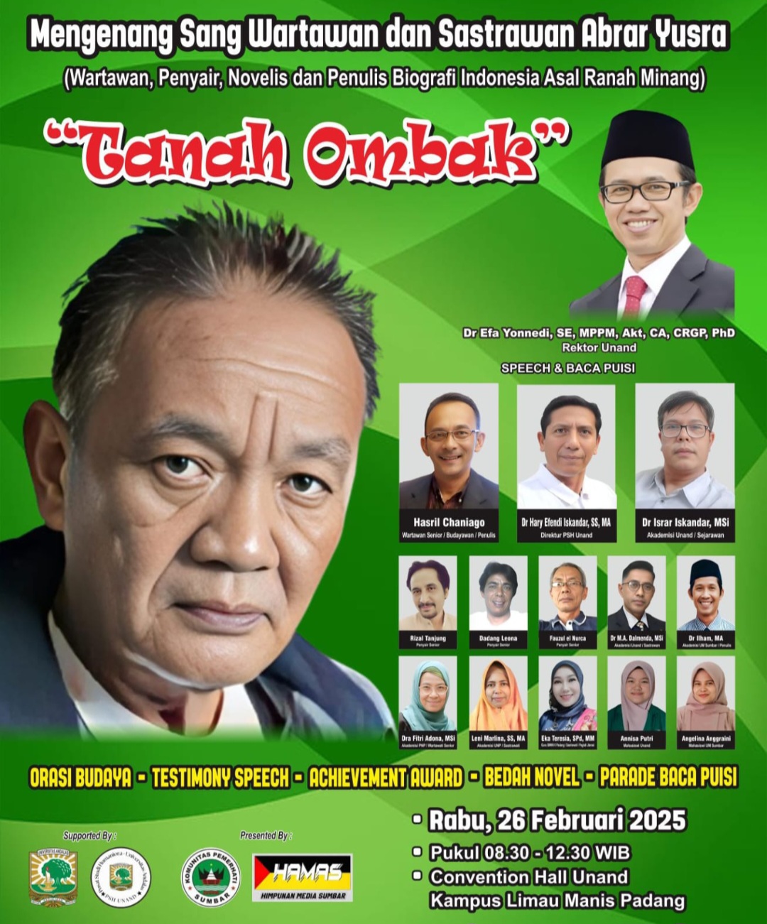 PADANG, AmanMakmur —Direktur PSH Unand (Pusat Studi Humaniora Universitas Andalas) Dr Hary Efendi Iskandar, SS, MA menyampaikan bahwa acara “Mengenang Sang Wartawan dan Sastrawan Abrar Yusra” akan digelar di Convention Hall Unand, Rabu 26 Februari 2025 mendatang, pukul 08.30-12.30 Wib.