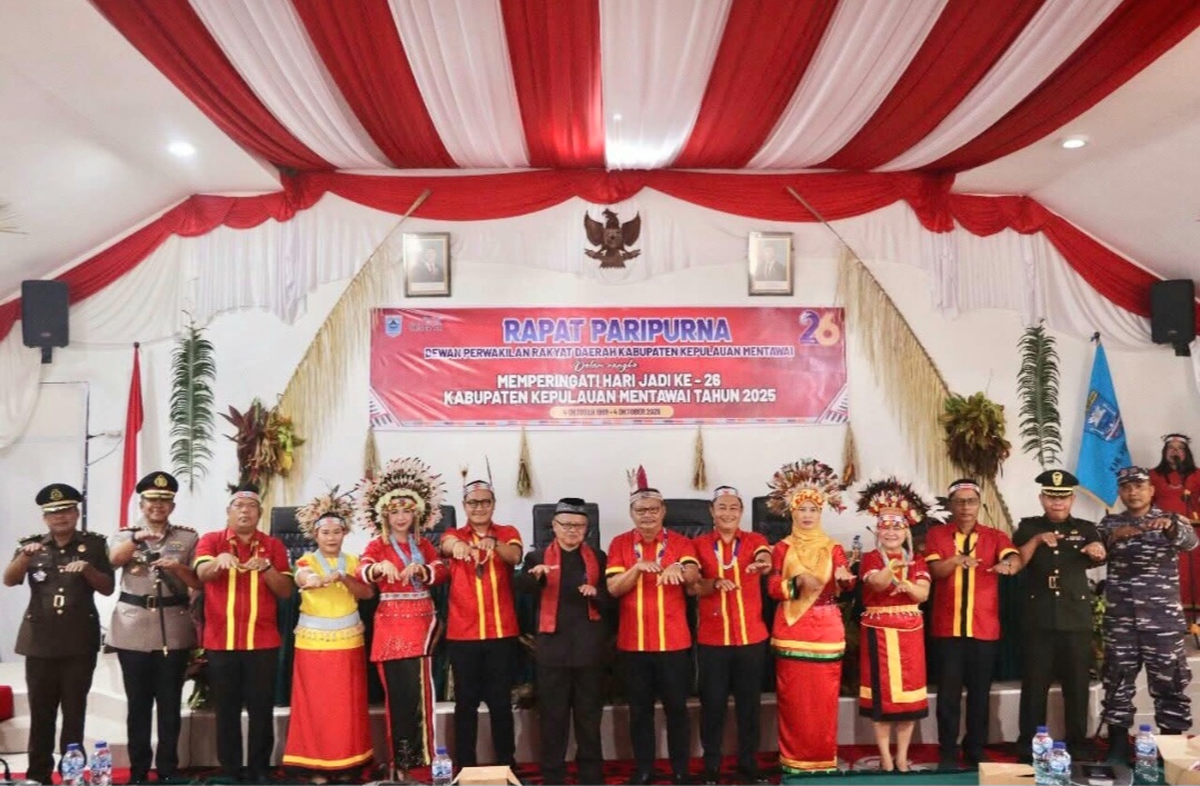 KEPULAUAN MENTAWAI, AmanMakmur —-Bupati Kepulauan Mentawai Rinto Wardana hadiri rapat Paripurna Hari Jadi ke-26 Kabupaten Kepulauan Mentawai, di ruang sidang Sekretariat DPRD Kabupaten Kepulauan Mentawai, di Tua Peijat, Sabtu, (4/10/2025).