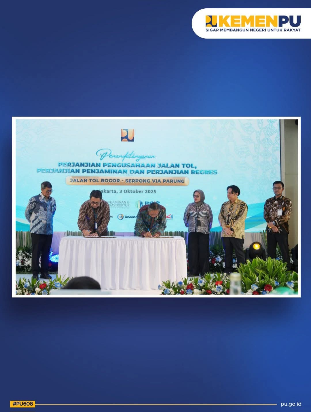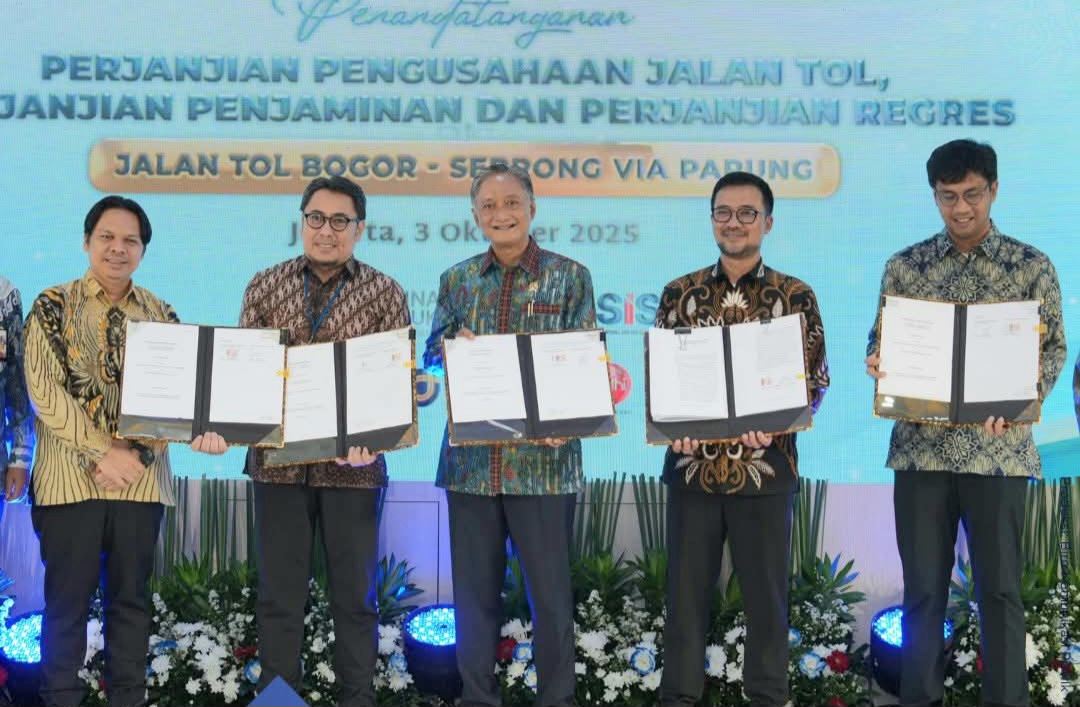 JAKARTA, AmanMakmur —Kementerian Pekerjaan Umum (PU) bersama Badan Usaha Jalan Tol (BUJT) PT Bogor Serpong Infra Selaras (BSIS) dan PT Penjamin Infrastruktur Indonesia (PII) secara resmi menandatangani Perjanjian Pengusahaan Jalan Tol (PPJT), Perjanjian Penjaminan, dan Perjanjian Regres untuk Jalan Tol Bogor–Serpong via Parung, pada Jumat 3 Oktober 2025.