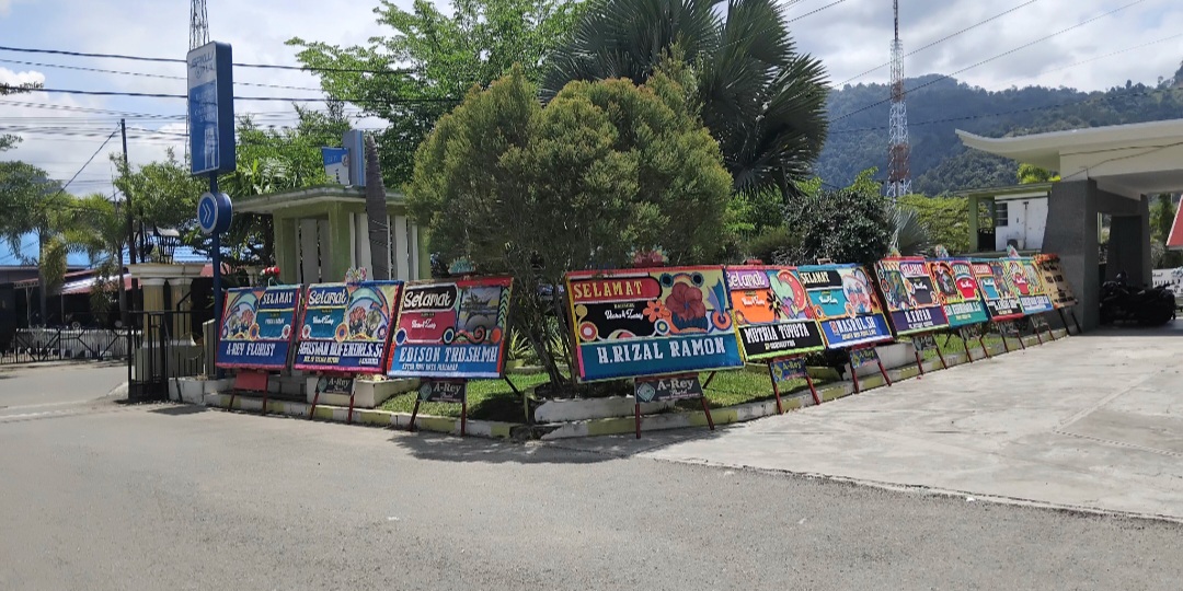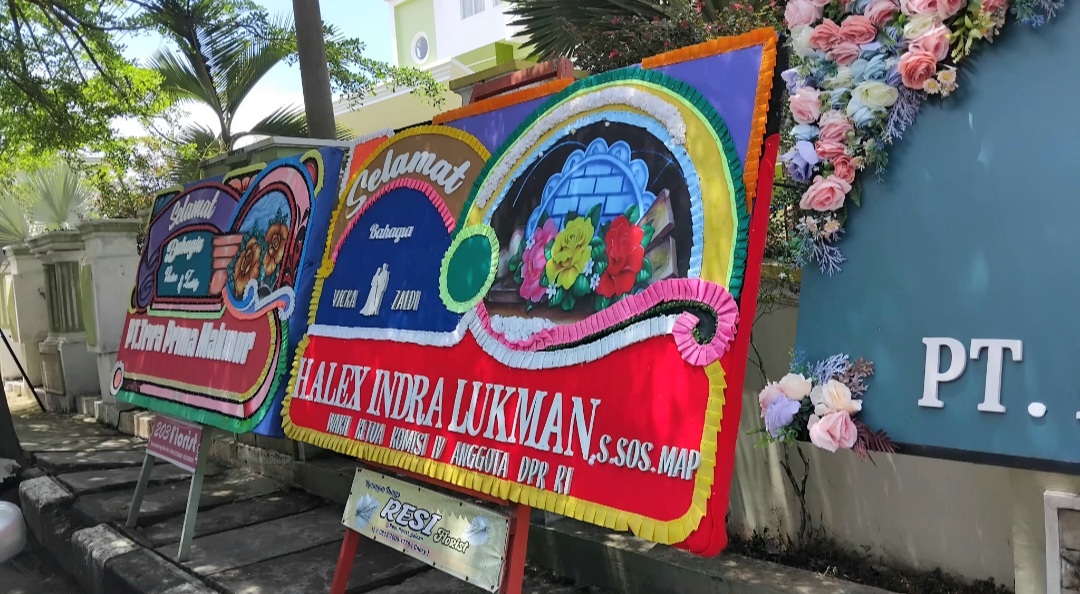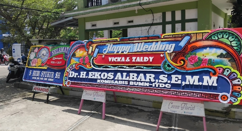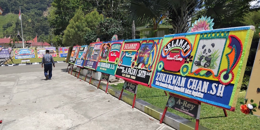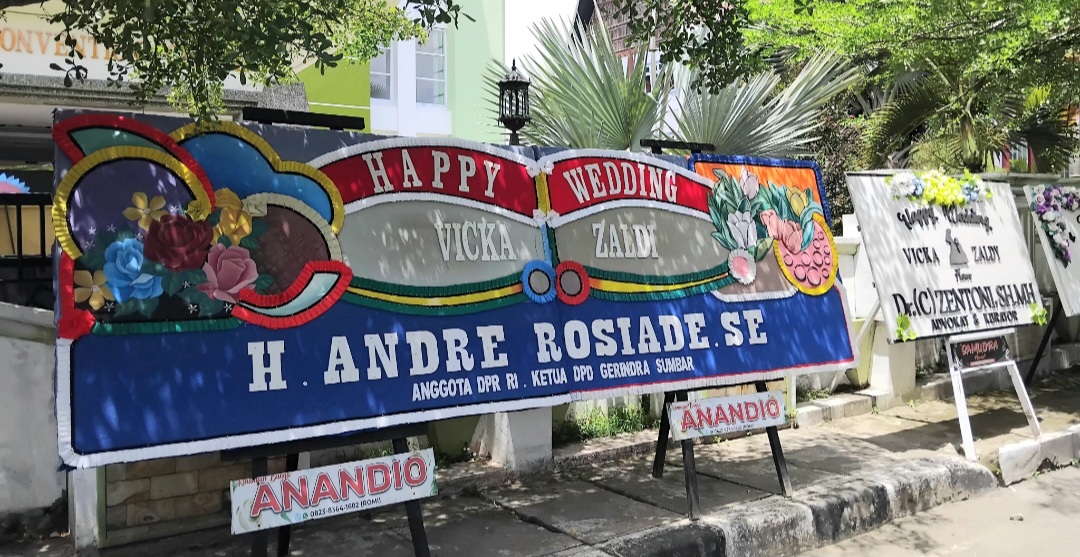 Tak lupa Indah menyampaikan ucapan terima kasih atas ucapan doa dan restu dalam bentuk karangan bunga yang terletak di luar gedung Painan Convention Center.