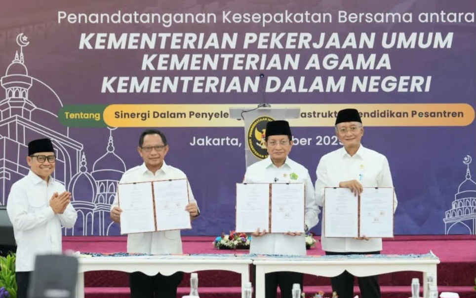 JAKARTA, AmanMakmur — Pemerintah memperkuat sinergi lintas kementerian dalam penyelenggaraan infrastruktur pendidikan pesantren melalui penandatanganan Kesepakatan Bersama Tiga Kementerian, yakni antara Kementerian Pekerjaan Umum, Kementerian Agama, dan Kementerian Dalam Negeri di Gedung Heritage Kemenko Bidang Pemberdayaan Masyarakat, Selasa (14/10/2025).
