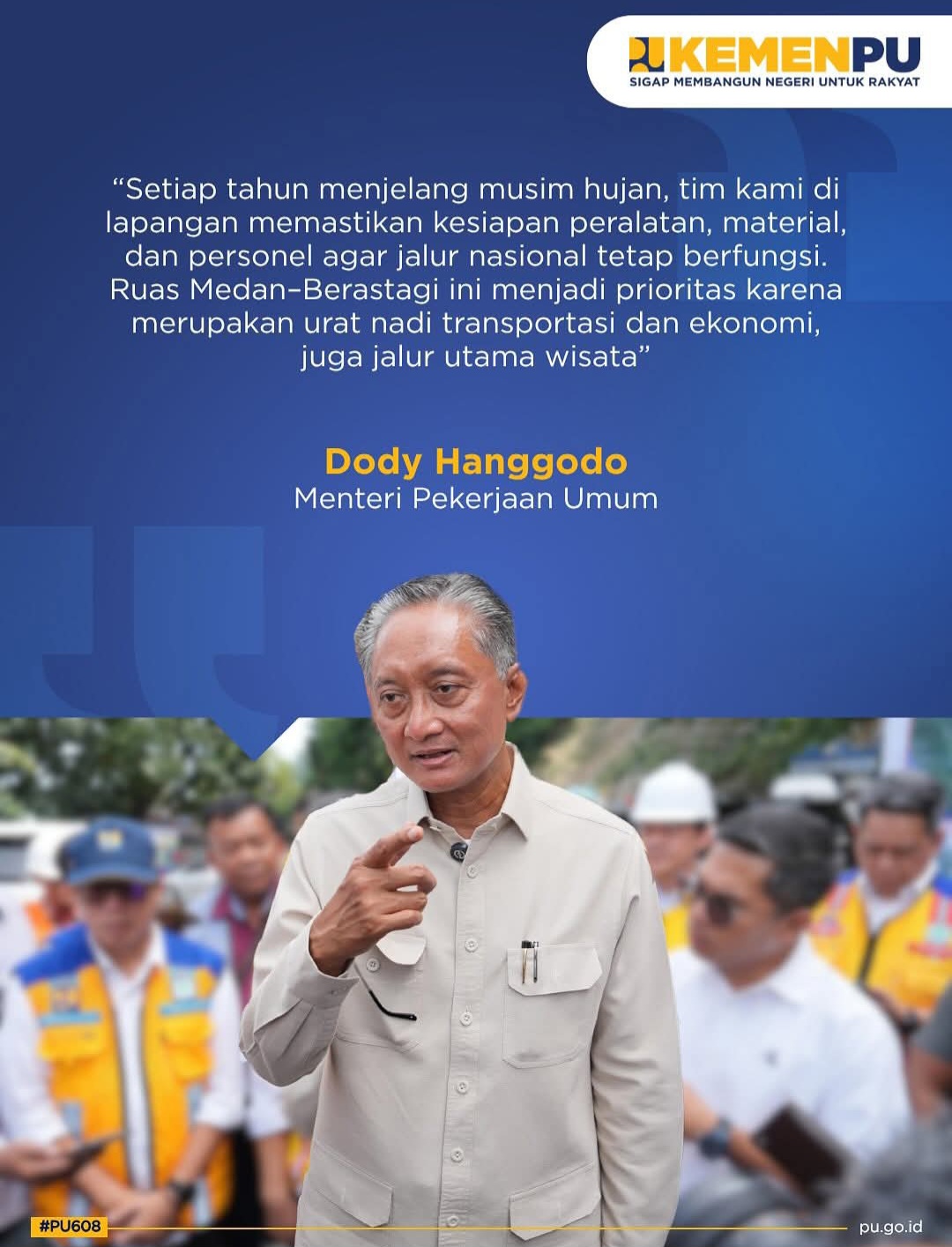 Menteri Dody Hanggodo menegaskan, Kementerian PU terus memperkuat tebing-tebing rawan longsor di berbagai daerah menghadapi musim hujan. “Penanganan ruas Medan–Berastagi menjadi prioritas karena berperan penting bagi transportasi, ekonomi, dan pariwisata Sumatera Utara,” ujar Menteri Dody.