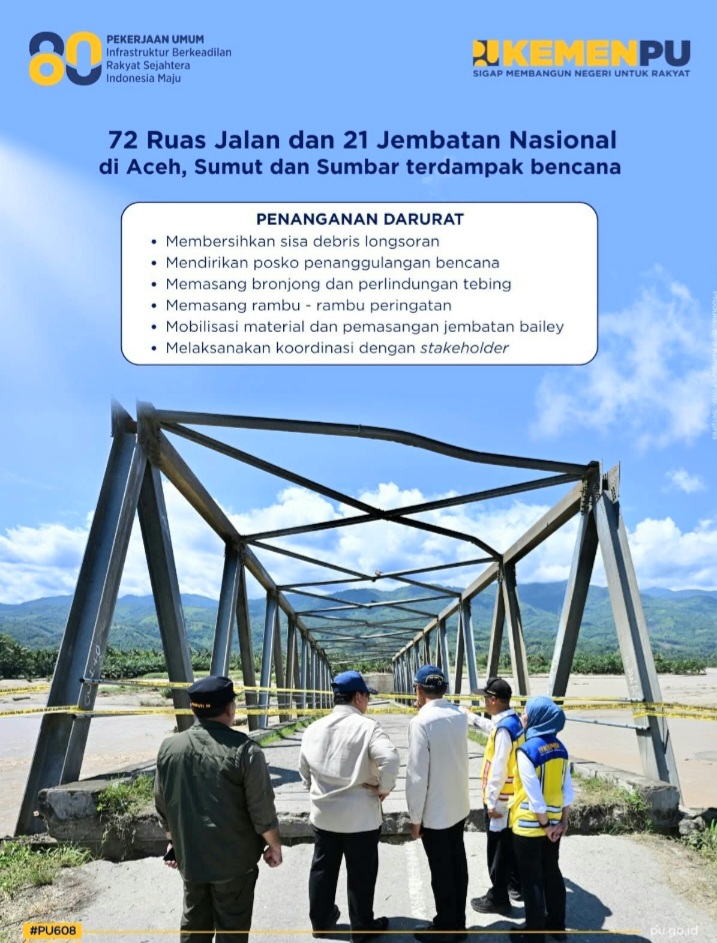 Percepatan pemulihan infrastruktur konektivitas pascabencana banjir dan tanah longsor di Provinsi Aceh, Sumut dan Sumbar, penanganan darurat dilaksanakan selama 24 jam agar seluruh konektivitas utama di tiga provinsi tersebut dapat segera kembali tembus guna mendukung distribusi logistik dan mobilitas masyarakat, khususnya pada periode Natal 2025 dan Tahun Baru 2026 (Nataru).
